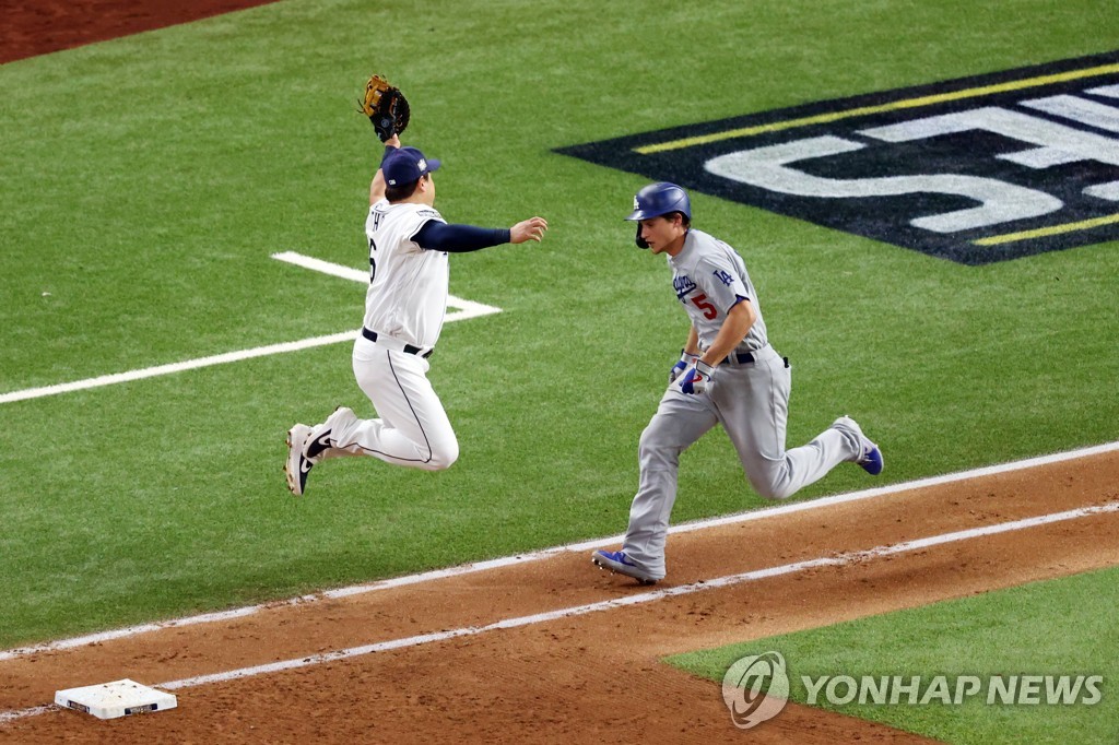 | ▲ In this Getty Images file photo from Oct. 23, 2020, Tampa Bay Rays first baseman Choi Ji-man (L) makes a leaping grab on a throw from third baseman Joey Wendle, with Corey Seager of the Los Angeles Dodgers running, during the top of the fourth inning of Game 3 of the World Series at Globe Life Field in Arlington, Texas. (Yonhap) |
