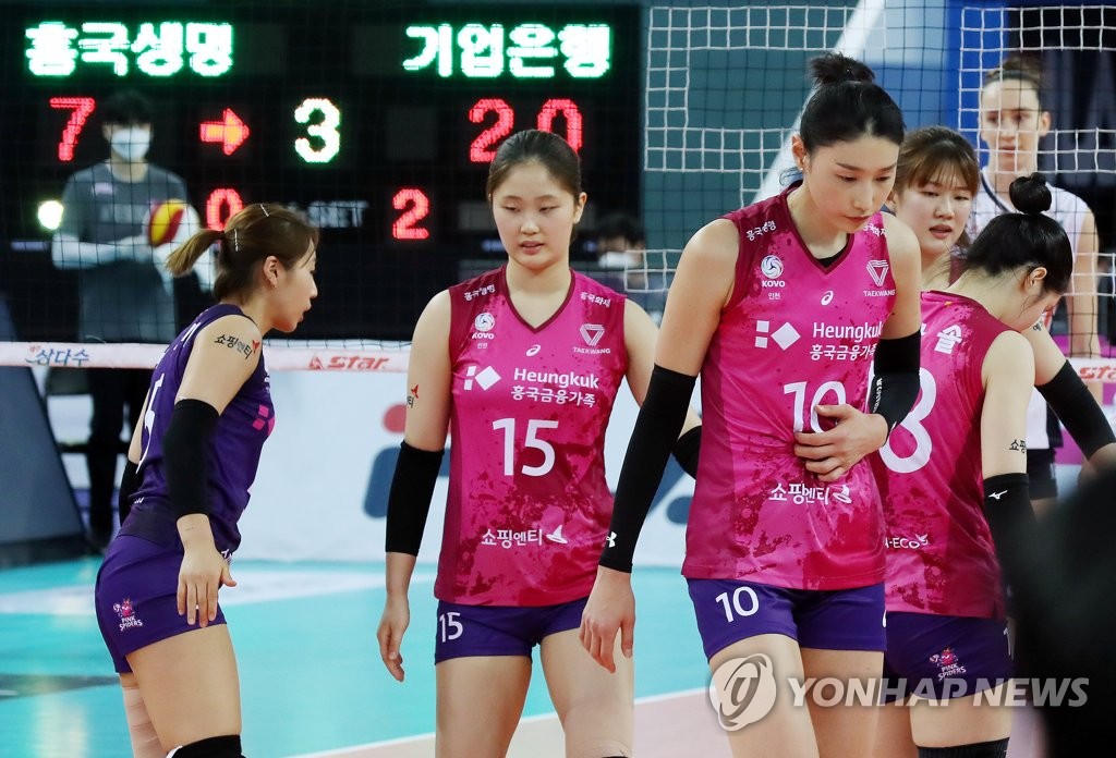 | ▲ Players of the Heungkuk Life Pink Spiders react to a lost point during a women's V-League match against the IBK Altos at Gyeyang Gymnasium in Incheon, just west of Seoul, on Feb. 16, 2021. (Yonhap) |