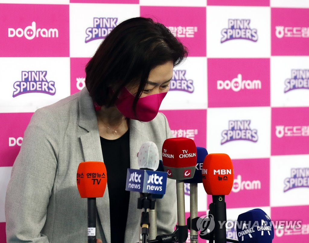 | ▲ Park Mi-hee, head coach of the Heungkuk Life Pink Spiders, bows after speaking to reporters before a women's V-League match against the IBK Altos at Gyeyang Gymnasium in Incheon, just west of Seoul, on Feb. 16, 2021. (Yonhap) |
