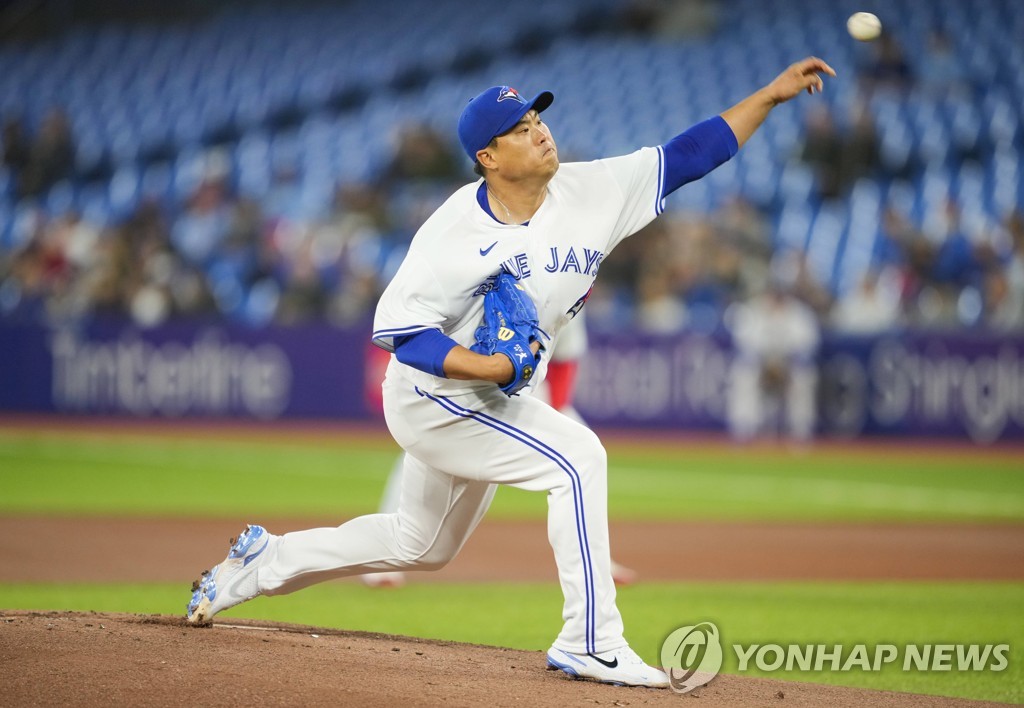 | ▲ In this Canadian Press photo via the Associated Press, Toronto Blue Jays' starter Ryu Hyun-jin pitches against the Oakland Athletics during the top of the first inning of a Major League Baseball regular season game at Rogers Centre in Toronto on April 16, 2022. (Yonhap) |