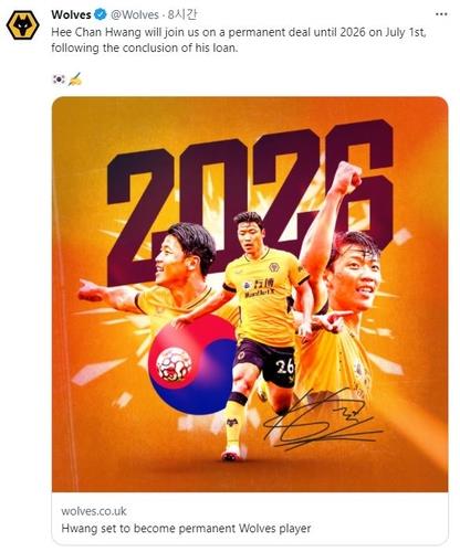 | ▲ This image captured from Wolverhampton Wanderers' Twitter page on Jan. 27, 2022, shows a tweet announcing the Premier League club's permanent deal with the South Korean forward Hwang Hee-chan. (PHOTO NOT FOR SALE) (Yonhap) |