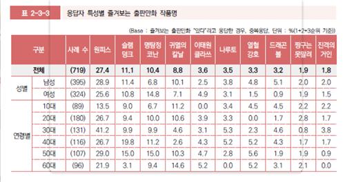 | ▲ 즐겨보는 출판만화 상위 10개 작품 ['2023 만화·웹툰 이용자 실태조사' 보고서 발췌] |