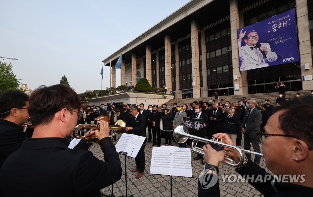| ▲ 배웅, 전국노래자랑 악단의 마지막 인사 (서울=연합뉴스) 홍해인 기자 = 10일 오전 서울 영등포구 KBS 본관 앞에서 열린 '국민 MC' 방송인 고(故) 송해 추모 노제에서 고인과 '전국노래자랑'을 함께해온 악단이 고인의 마지막 길을 연주로 배웅하고 있다. 2022.6.10 hihong@yna.co.kr |