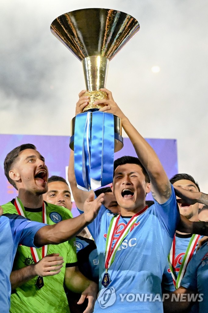 | ▲ 세리에A 우승 트로피 들고 기뻐하는 나폴리 김민재 (나폴리 EPA=연합뉴스) 이탈리아 프로축구 세리에A 나폴리 김민재(가운데)가 4일(현지시간) 나폴리 디에고 아르만도 마라도나 스타디움에서 열린 2022-2023 세리에A 38라운드 경기에서 삼프도리아를 꺾은 뒤 트로피를 들고 환호하고 있다. 이날 열린 시즌 최종전에서 나폴리는 삼프도리아를 2-0으로 꺾고 우승을 차지했다. 2023.06.05 ddy04002@yna.co.kr |