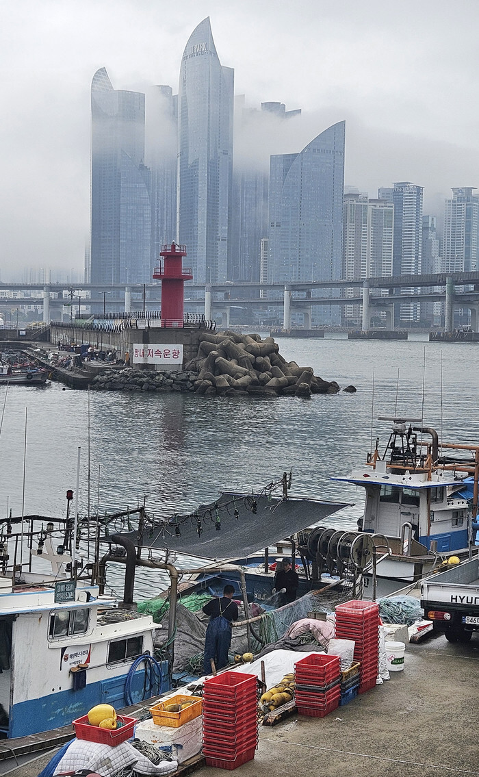 High-rise residential buildings are shrouded in sea fog in Haeundae in the southeastern port city of Busan on June 16, 2025. (Yonhap)