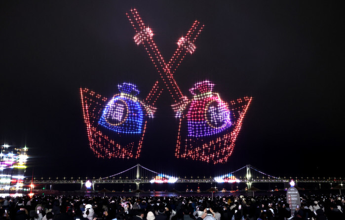 Drones are lit up to create an image of "bokjori," traditional Korean rice strainers, over an beach in the southeastern port city of Busan on Jan. 26, 2025, the second day of a six-day break for Seol, Lunar New Year's Day that falls on Jan. 29. The strainers can be used to remove tiny stones and other unwanted particles from rice, but are more usually hung in Korean homes as a good luck charm early in the year. (Yonhap)