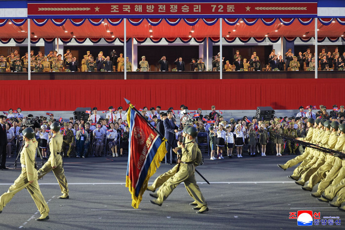 North Korean soldiers march in a parade in Pyongyang on July 27, 2025, to celebrate the 72nd anniversary the same day of the armistice that halted the 1950-53 Korean War, in this photo released by the North's official Korean Central News Agency the next day. North Korea refers to the three-year conflict as the Great Fatherland Liberation War and designates the date of the armistice signing as Victory Day. (For Use Only in the Republic of Korea. No Redistribution) (Yonhap)