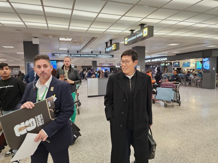Football star Cha Bum-kun (R), former head coach of the South Korean men's national football team, arrives at Dulles International Airport, near Washington, D.C., on Dec. 3, 2025, to attend the draw for the 2026 FIFA World Cup. (Yonhap)
