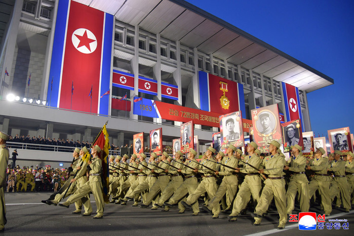North Korean soldiers, carrying portraits of former military leaders, march in a parade in Pyongyang on July 27, 2025, to celebrate the 72nd anniversary the same day of the armistice that halted the 1950-53 Korean War, in this photo released by the North's official Korean Central News Agency the next day. North Korea refers to the three-year conflict as the Great Fatherland Liberation War and designates the date of the armistice signing as Victory Day. (For Use Only in the Republic of Korea. No Redistribution) (Yonhap)