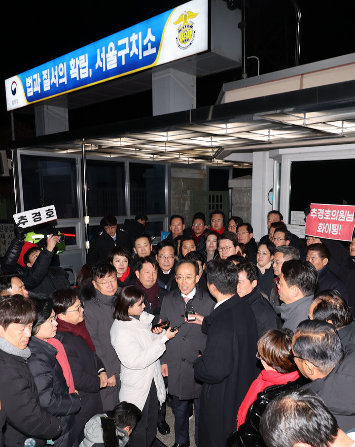 Choo Kyung-ho (C), former floor leader of the main opposition People Power Party, speaks to reporters following his release from the Seoul Detention Center in Uiwang, south of Seoul, on Dec. 3, 2025, after a court rejected an arrest warrant that special counsel Cho Eun-suk's team had sought for him over allegations that he obstructed lawmakers from participating in a vote to revoke former President Yoon Suk Yeol's Dec. 3 martial law declaration. (Yonhap)