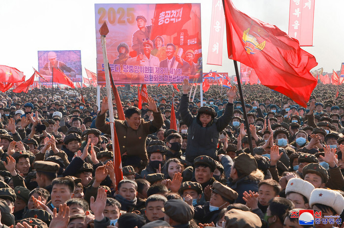 A crowd of North Korean residents cheer as they take part in a groundbreaking ceremony in Sinuiju, North Pyongan Province, on Feb. 10, 2025, for a 450-hectare greenhouse farm and vegetable science research base, in this photo released by the North's official Korean Central News Agency the next day. The North's leader Kim Jong-un attended the ceremony. (For Use Only in the Republic of Korea. No Redistribution) (Yonhap)