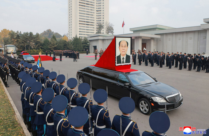 A North Korean Army honor guard lines up as a hearse carrying the coffin of Kim Yong-nam, former chief of North Korea's parliament, leaves the Sojang Club funeral hall in Pyongyang on Nov. 5, 2025, during a state funeral for him, in this photo released by the North's official Korean Central News Agency the next day. Kim, who long served as the country's ceremonial head of state, died Nov. 3. (For Use Only in the Republic of Korea. No Redistribution) (Yonhap)