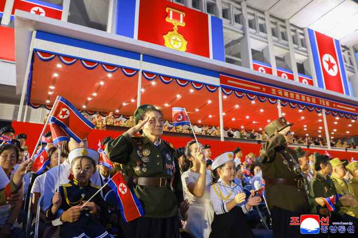 Two North Korean war veterans give a salute as North Korean soldiers march in a parade in Pyongyang on July 27, 2025, to celebrate the 72nd anniversary the same day of the armistice that halted the 1950-53 Korean War, in this photo released by the North's official Korean Central News Agency the next day. North Korea refers to the three-year conflict as the Great Fatherland Liberation War and designates the date of the armistice signing as Victory Day. (For Use Only in the Republic of Korea. No Redistribution) (Yonhap)