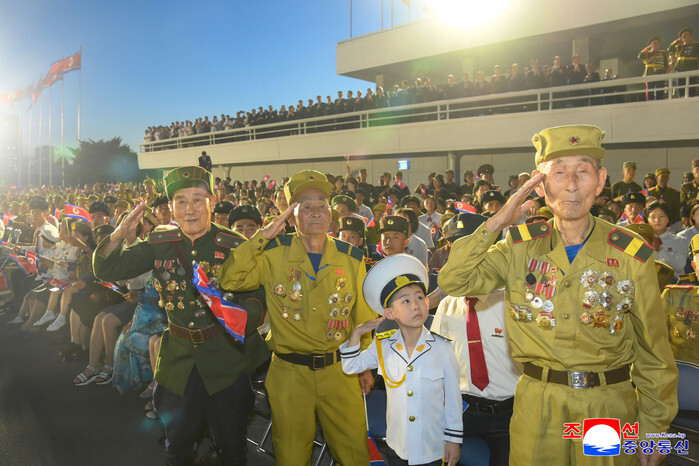 North Korean war veterans and a boy give a salute as North Korean soldiers march in a parade in Pyongyang on July 27, 2025, to celebrate the 72nd anniversary the same day of the armistice that halted the 1950-53 Korean War, in this photo released by the North's official Korean Central News Agency the next day. North Korea refers to the three-year conflict as the Great Fatherland Liberation War and designates the date of the armistice signing as Victory Day. (For Use Only in the Republic of Korea. No Redistribution) (Yonhap)