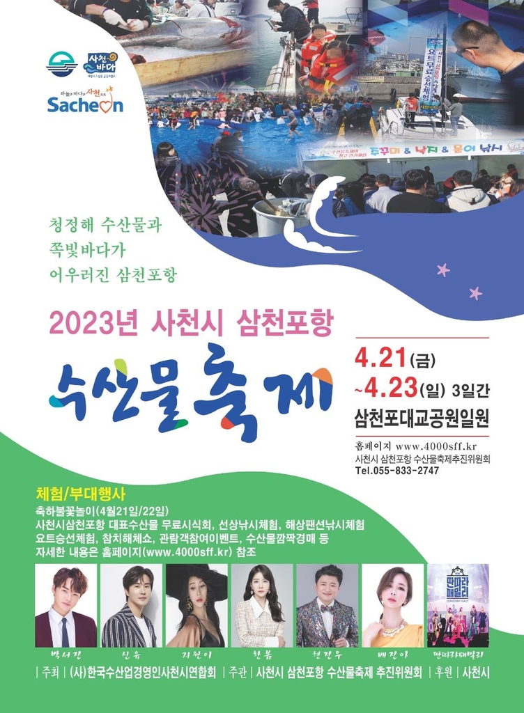 (사천=연합뉴스) 지성호 기자 = 경남 사천시는 '2023년 사천시 삼천포항 수산물축제'를 4월 21일부터 23일까지 대방동 삼천포대교공원 일원서 연다고 1일 밝혔다.
