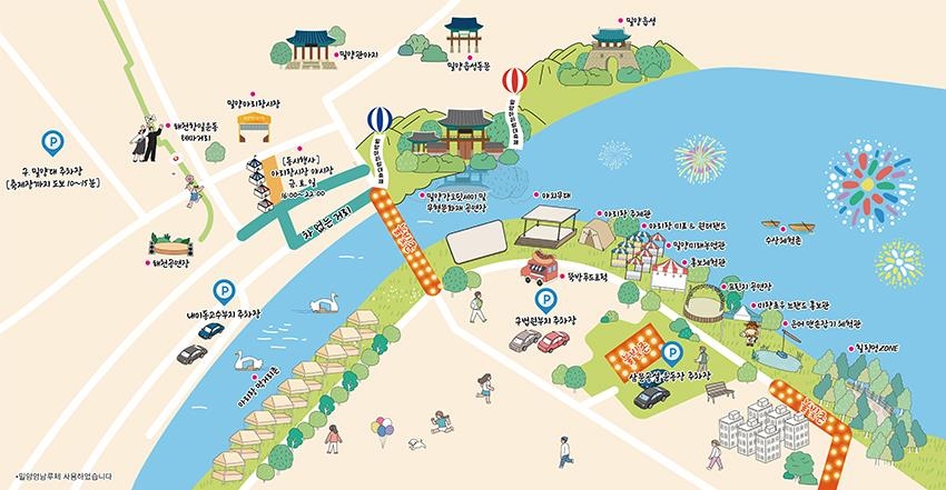 21일까지 이어지는 축제 행사장은 밀양시를 상징하는 누각 영남루와 밀양 시가지를 휘감아 흐르는 밀양강변 일대.