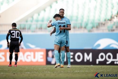 | ▲ Edgar of Daegu FC (rear) is embraced by teammate Cesinha after scoring a goal against United City in the clubs' Group I match at the Asian Football Confederation Champions League at Bunyodkor Stadium in Tashkent on July 11, 2021, in this photo provided by the Korea Professional Football League. (PHOTO NOT FOR SALE) (Yonhap) |