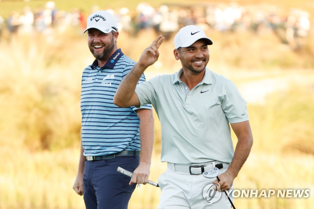 | ▲ 2라운드 18번 홀 버디 이후 인사하는 마크 리슈먼과 제이슨 데이 [게티이미지/AFP=연합뉴스] |