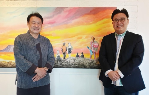 | ▲ 김대년 작가(왼쪽)와 서경덕 교수가 그림 앞에 서서 기념 촬영을 하고 있다 [서 교수 제공] |