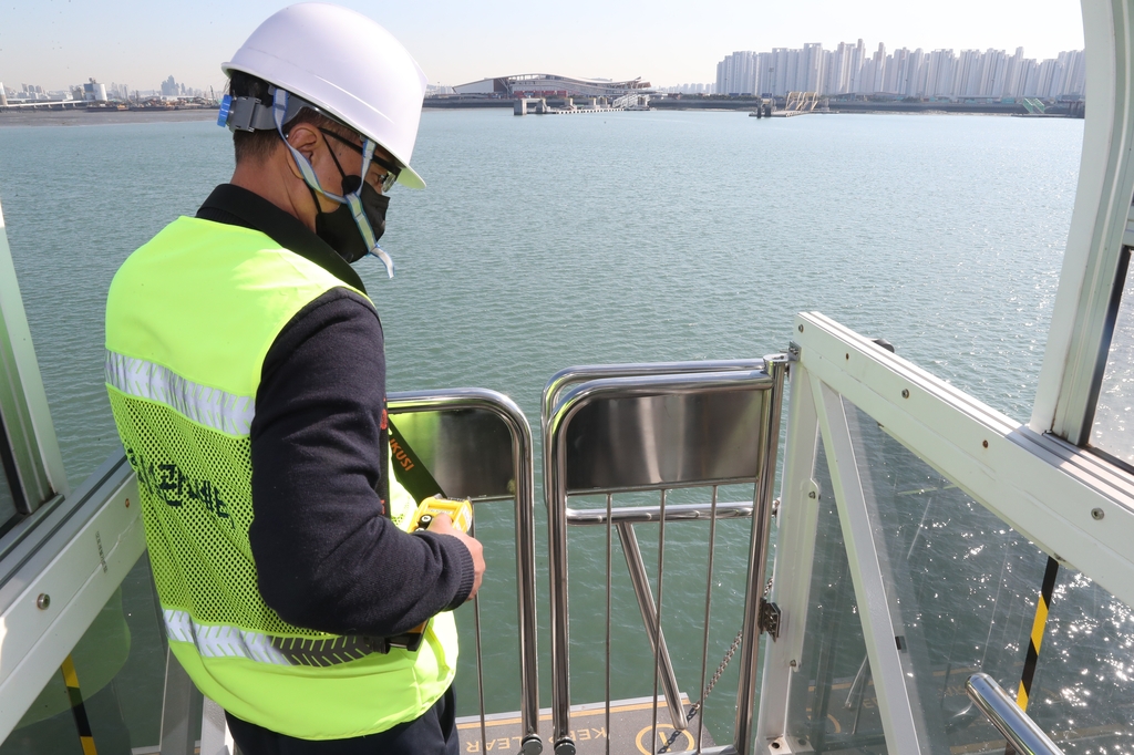 조수간만 차가 큰 인천항 특성에 맞춰 최대 14m까지 높이 조절이 가능한 여객 승강장치(갱웨이)를 직접 작동해보면서 이상이 없는지 확인했다.