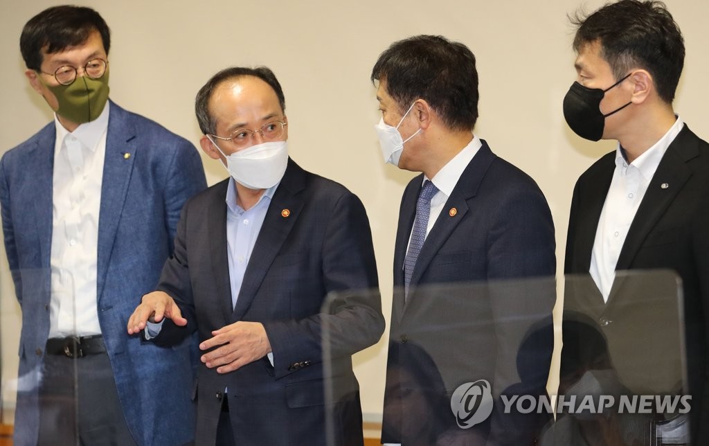 | ▲ Finance Minister Choo Kyung-ho (2nd from L) speaks with Kim Joo-hyun, chairman of the Financial Services Commission (2nd from R), ahead of an emergency meeting on macroeconomic situations in Seoul on July 28, 2022. The other participants were Bank of Korea Gov. Rhee Chang-yong (L) and Lee Bok-hyun, chief of the Financial Supervisory Service. (Pool Photo) (Yonhap) |