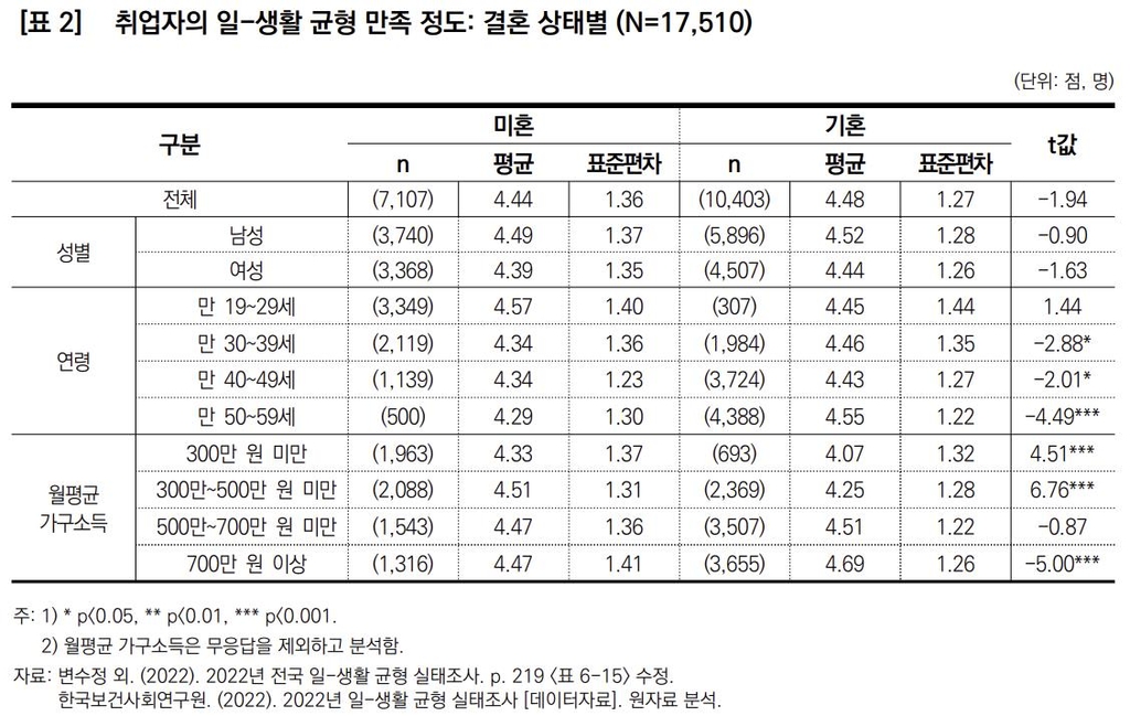 30일 한국보건사회연구원(보사연)의 월간 전문지 '보건복지포럼' 최신호에 실린 '일-생활 균형과 삶의 만족'(변수정) 보고서에 따르면 보사연의 '2022년 일-생활 균형 실태조사' 결과를 분석한 결과 워라밸 만족도는 20대 때는 미혼자가 높았지만 30대 이후에는 반대로 기혼자가 높았다.