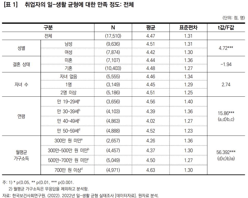 보고서는 "30대 이상에서 워라밸 만족 수준은 기혼이 미혼보다 높았고 삶의 만족도도 기혼 집단에서 컸다"며 "한국에서 일-생활 균형에 대한 관심은 일·가정 양립으로 출발했고, 기혼, 자녀 양육 가족이 실질적인 정책 대상이었지만, 가족 단위가 아니라 일과 개인 생활로 확장된 차원에서 균형을 강조할 필요가 있다"고 강조했다.