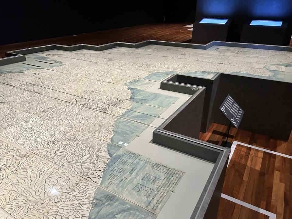 대동여지도 실물과 조금 떨어진 공간 바닥에는 확대된 크기의 인쇄물을 설치해 그 시절 우리 땅을 발로 디뎌보는 듯한 경험도 느낄 수 있다.