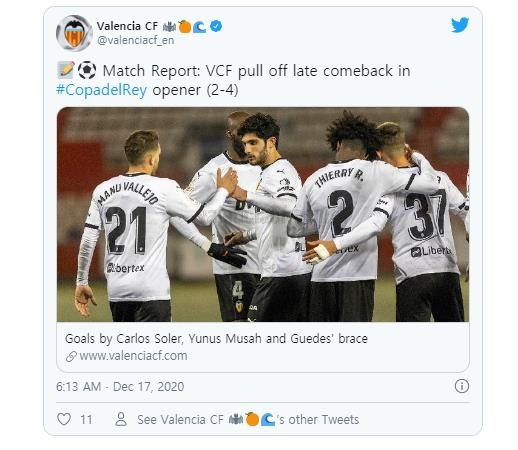| ▲ 코파 델 레이 1라운드 승리 소식을 전한 발렌시아. [발렌시아 구단 트위터. 재판매 및 DB 금지] |