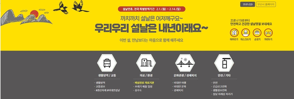 (부산=연합뉴스) 김선호 기자 = 부산시는 설 연휴 신종 코로나바이러스 감염증 정보를 한 눈에 찾는 설 연휴 생활방역 사이트를 운영한다고 8일 밝혔다.