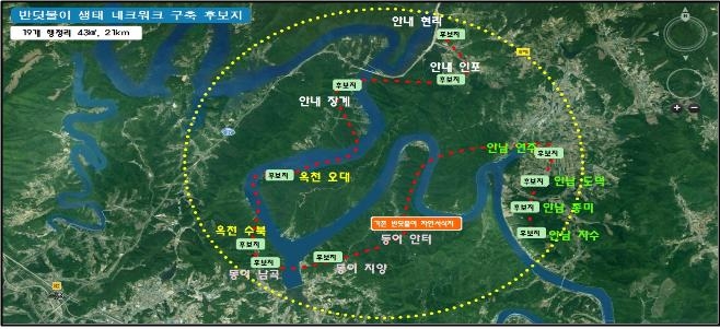 8일 옥천군에 따르면 서식지 조성사업 대상지는 안내면 장계리, 옥천읍 수북리, 동이면 안터마을, 안남면 연주리로 이어지는 21㎞ 구간이다. 대청호를 끼고 있는 곳이다.