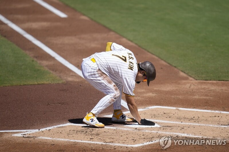 | ▲ 홈에 들어오고 다음 타자를 위해 홈플레이트를 닦는 김하성 [AFP/게티이미지=연합뉴스] |
