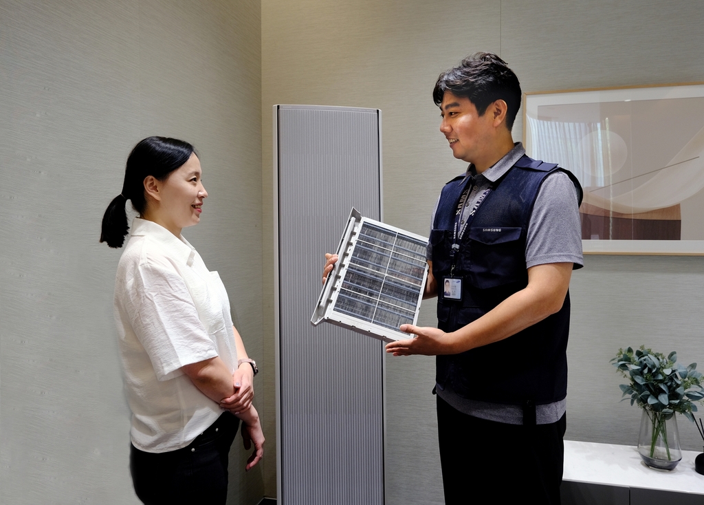 | ▲ 삼성전자서비스, 가전·휴대전화 서비스 품질지수 1위 삼성전자서비스 엔지니어가 소비자에게 서비스를 제공하는 모습. [삼성전자서비스 제공·재판매 및 DB 금지] |