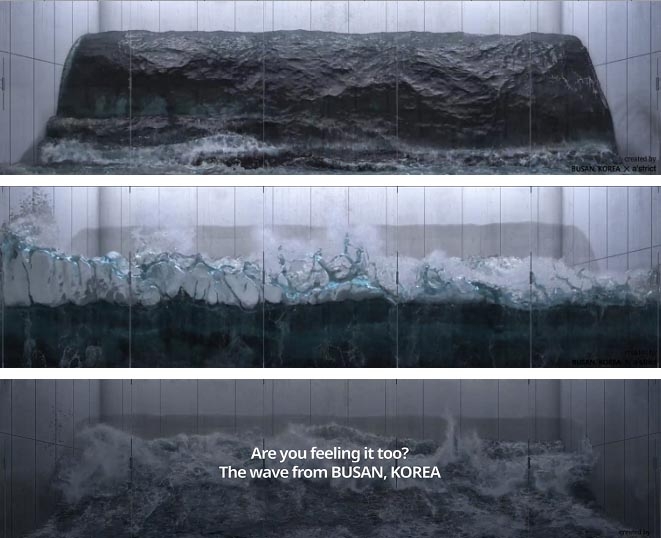 착시 현상으로 입체감을 구현하는 '아나몰픽 일루전' 기법을 적용한 이 작품은 90초간 보는 이를 집어삼킬 듯 힘차게 다가오는 파도가 유리 벽에 부딪히며 사그라드는 모습으로, 강렬한 이미지를 남긴다.