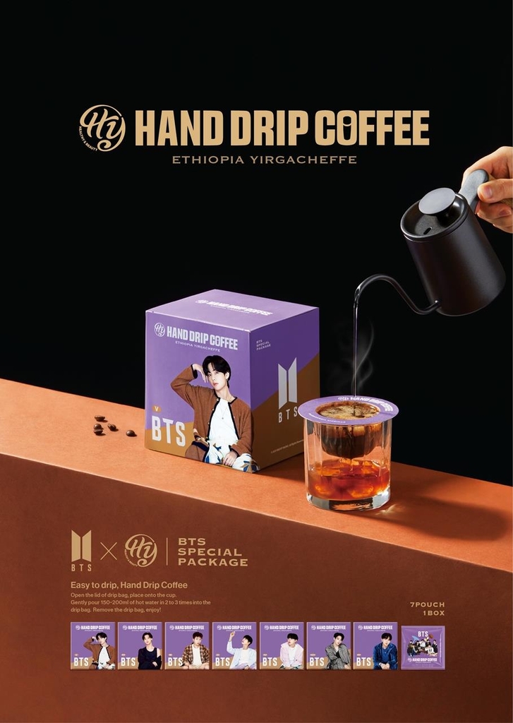 BTS핸드드립커피는 한류 열풍을 주도하고 있는 방탄소년단(BTS) 이미지가 패키지 디자인에 담겨있다.