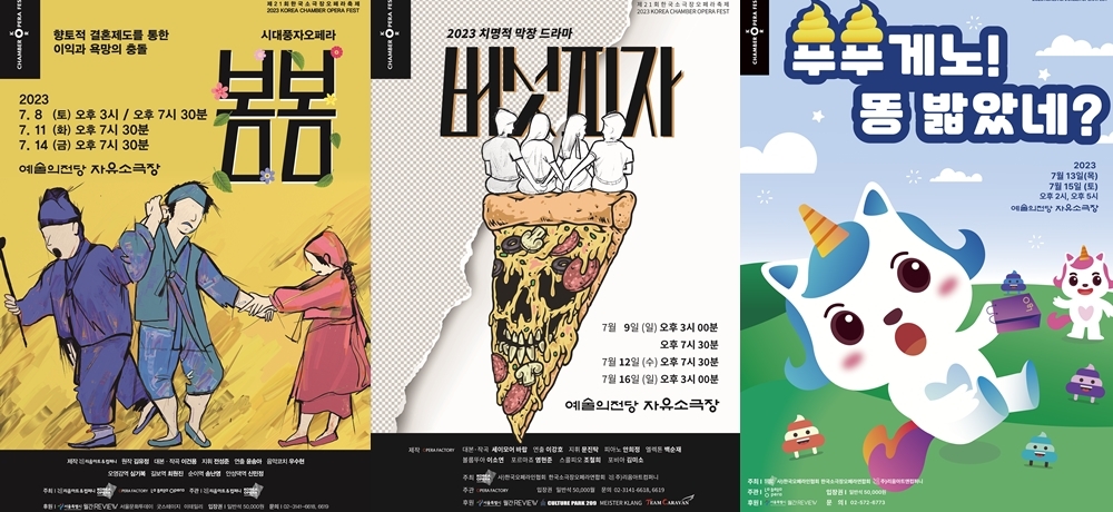 | ▲ 제21회 한국소극장오페라축제 참가작 포스터 왼쪽부터 '봄봄', '버섯피자', '푸푸게노! 똥 밟았네?'. [한국소극장오페라축제 운영위원회 제공. 재판매 및 DB 금지] |