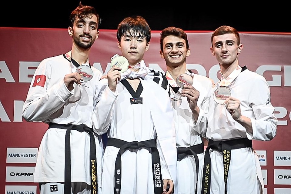 | ▲ 금메달리스트 박태준(왼쪽에서 두 번째) 등 남자 58㎏급 입상자들. [세계태권도연맹 제공. 재판매 및 DB 금지] |
