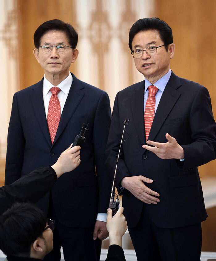 Former Employment and Labor Minister Kim Moon-soo (L) and North Gyeongsang Province Gov. Lee Cheol-woo, both affiliated with the conservative People Power Party, meet the press during their meeting at the Park Chung-hee Presidential Museum in Seoul on April 15, 2025. Kim and Lee have joined the party's nomination race for the June 3 presidential election to pick former President Yoon Suk Yeol's successor. (Yonhap)