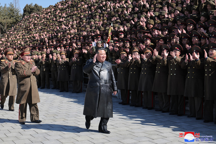 North Korean leader Kim Jong-un (C) waves as he visits the Kim Il Sung University of Politics, the supreme military and political school of the armed forces, in Pyongyang on Feb. 24, 2025, in this photo released by the North's official Korean Central News Agency the next day. In a speech, Kim emphasized the "ideology-first" principle and loyalty in building a powerful military. (For Use Only in the Republic of Korea. No Redistribution) (Yonhap)