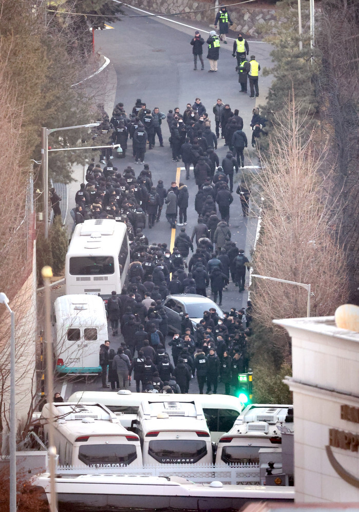 Investigators from the police make their way to the premises of impeached President Yoon Suk Yeol's official residence in Seoul on Jan. 15, 2025, after police and the anti-corruption agency began their second attempt to execute a warrant to detain Yoon in connection to his short-lived imposition of martial law. (Yonhap)