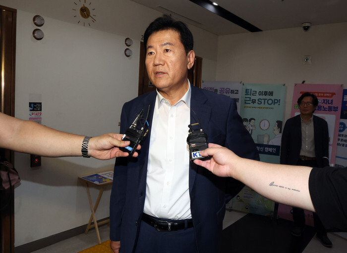 Ryu Gi-jeong, executive director of the Korea Enterprises Federation, speaks to reporters after attending the 12th plenary session of the Minimum Wage Commission at the government complex in Sejong, central South Korea, on July 10, 2025. The commission, composed of members from labor, business and the general public, voted 23-0 to pass a proposal to set next year's minimum hourly wage at 10,320 won (US$7.51), up 2.9 percent on-year, marking the first agreement reached among the three sides in 17 years. (Yonhap)