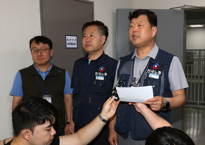 Ryu Ki-seob (R), secretary general of the Federation of Korean Trade Unions, speaks to reporters after attending the 12th plenary session of the Minimum Wage Commission at the government complex in Sejong, central South Korea, on July 10, 2025. The commission, composed of members from labor, business and the general public, voted 23-0 to pass a proposal to set next year's minimum hourly wage at 10,320 won (US$7.51), up 2.9 percent on-year, marking the first agreement reached among the three sides in 17 years. (Yonhap)