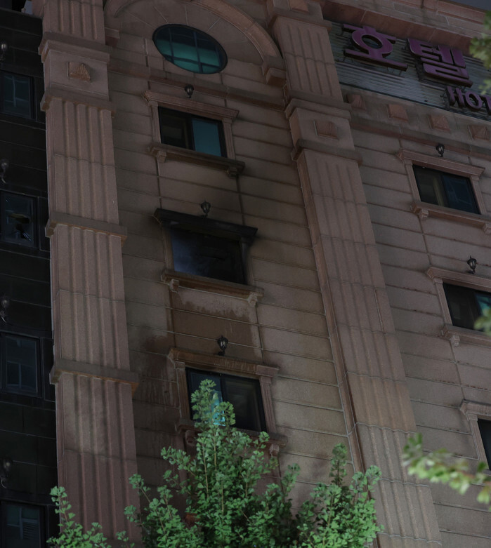 This photo shows the burned exterior of a hotel in Bucheon, west of Seoul, following a deadly fire on Aug. 22, 2024. The fire began in a room on the eighth floor of the nine-story hotel at 7:39 p.m., leaving seven people dead and 12 others injured. (Yonhap)