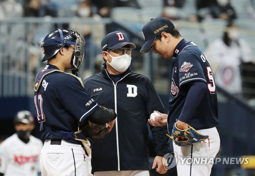 | ▲ 김태형(가운데) 감독과 이영하(오른쪽) [연합뉴스 자료사진] |