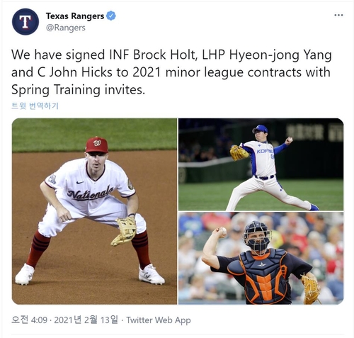 MLB 텍사스 레인저스 구단은 양현종, 포수 겸 1루수 존 힉스, 내야수 브록 홀트와 마이너리그 계약을 하고 이들을 스프링캠프에 초청한다고 13일(한국시간) 공식 발표했다.