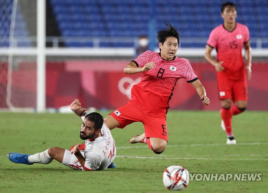 | ▲ In this file photo from Aug. 1, 2021, Lee Kang-in of South Korea (R) gets tripped up by Jose Joaquin Esquivel of Mexico during the quarterfinals of the Tokyo Olympic men's football tournament at International Stadium Yokohama in Yokohama, Japan. (Yonhap) |