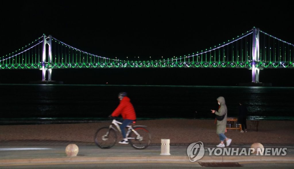 (부산=연합뉴스) 김선호 기자 = 부산 랜드마크인 광안대교, 영화의 전당, 부산타워가 17일 밤 녹색으로 물든다.