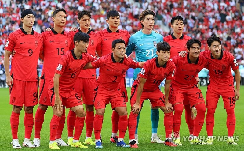 | ▲ 팀포토 찍는 대표팀 선수들 (도하=연합뉴스) 김도훈 기자 = 20일(현지시간) 카타르 도하 앗수마마 스타디움에서 열린 2023 아시아축구연맹(AFC) 카타르 아시안컵 조별리그 E조 2차전 요르단과 한국의 경기 시작에 앞서 대표팀 선수들이 팀포토를 찍고 있다. 2024.1.21 superdoo82@yna.co.kr |