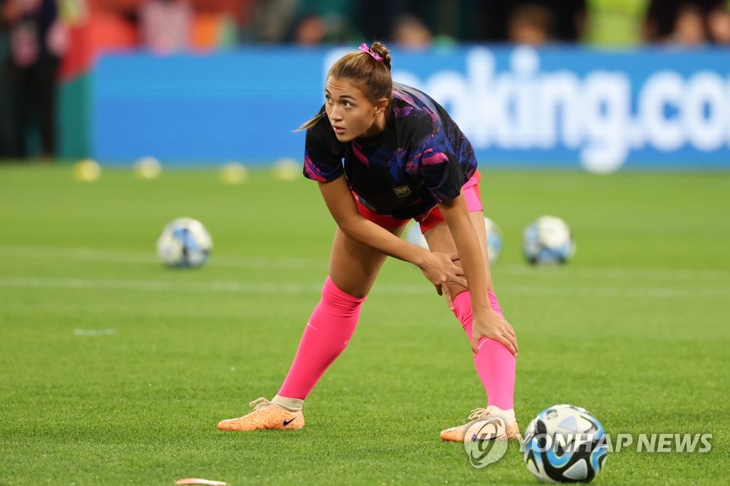 | ▲ 케이시 유진 페어 (브리즈번=연합뉴스) 김주성 기자 = 3일 오후(한국시간) 호주 퀸즐랜드주의 브리즈번 스타디움에서 열린 2023 국제축구연맹(FIFA) 호주·뉴질랜드 여자월드컵 H조 3차전 한국 대 독일 경기. 대회 참가 선수 중 최연소인 케이시 유진 페어가 선발 출전 명단에 올라 경기 전 몸을 풀고 있다. 2023.8.3 utzza@yna.co.kr |