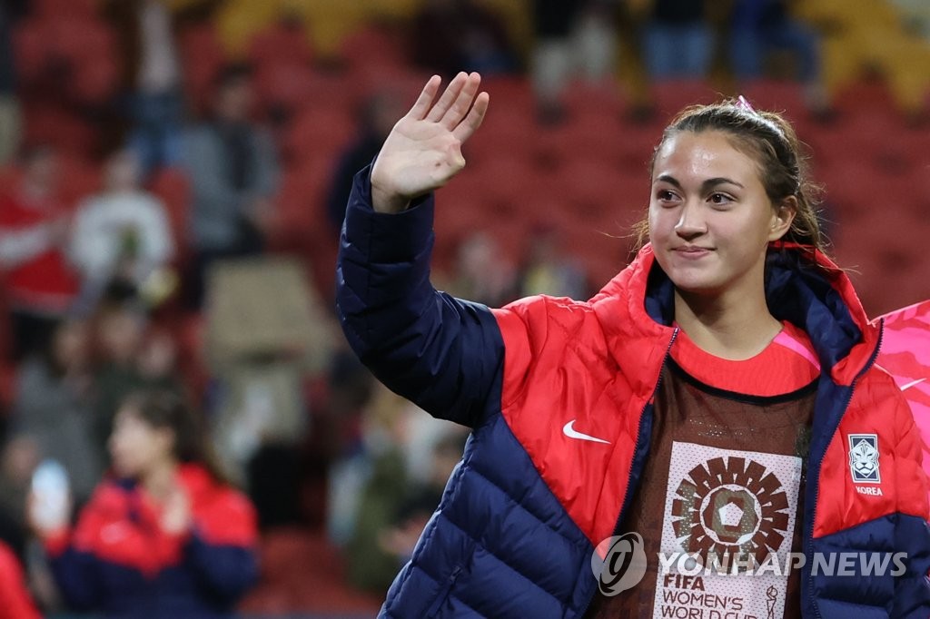 | ▲ 관중 향해 인사하는 페어 (브리즈번=연합뉴스) 김주성 기자 = 3일 오후(한국시간) 호주 퀸즐랜드주의 브리즈번 스타디움에서 열린 2023 국제축구연맹(FIFA) 호주·뉴질랜드 여자월드컵 H조 3차전 한국 대 독일 경기. 케이시 유진 페어가 1-1 무승부로 경기 종료 후 그라운드를 돌며 관중을 향해 인사하고 있다. 2023.8.3 utzza@yna.co.kr |